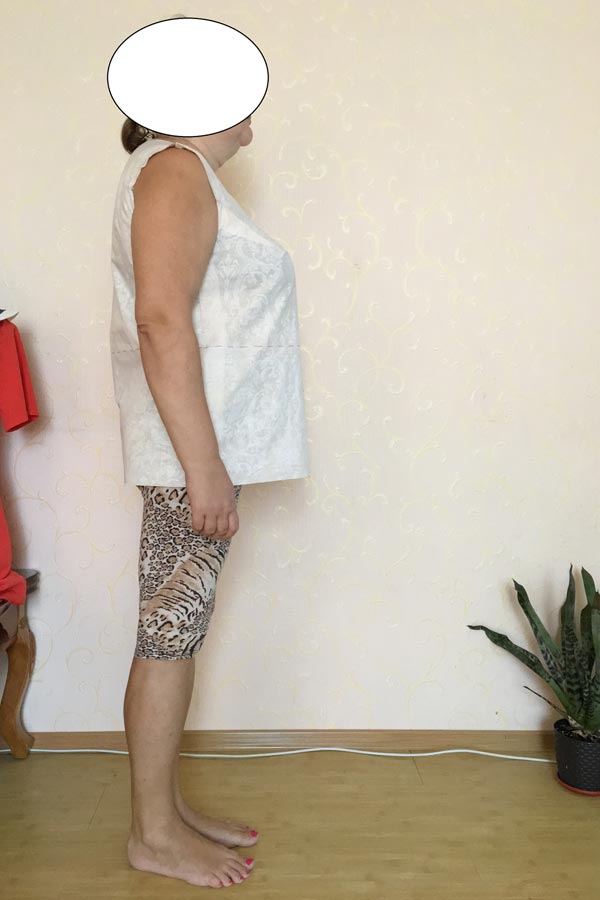 Татьяна Попова(СПб) Опубликовано 15 августа, 2017 Автор Поделиться #2580 Опубликовано 15 августа, 2017 ДС -45,5, ДСТ -441. Вы делали наклон плеча через пересечение сетки?Разница Дс-Дст=1,5 см- по этому значению получится ооочень маленький наклон плеча- даже для высоких (?) и нормальных плеч.У Вас плечи низкие. Наклон плеча можно увеличить.Можно использовать мерки Впкс и Впкп.Можно просто чуть увеличить.2. Вам нужно измерять и использовать мерку Тп. Посмотрите на фото сбоку (жёлтая горизонталь): - если при снятии мерок резинка не горизонтальна,- нужны мерки Тп, Тс.3. Пхл > 0 - смотрим на то же фото (зеленая вертикаль).И по анализу фото пробника сбоку- мне хотелось убрать передний "клёш-клюв".4. ЗХ - 4, ЗХЛ - 6- не вижу такой большой разницы (то же фото- красная вертикаль).5. Ваши мерки: БХ -2, БХЛ - 3 - вряд ли верные. Смотрим фото: относительно красной вертикали линия бёдер и линия подмышки (абрис фигуры) - мерка Бхл близка 0, мерка Бх > Бхл.У Вас: Бхл > БхКрасная вертикаль проведена как касательная к резинке-в точке пересечения линии талии и линии бока. 6. Наклон плеч надо уравновесить:- либо наклон плечевого среза с правой стороны сделать больше- либо подложить подплечник.Если это сделать, то красные заломы уйдут и линия талии из наклонной станет горизонтальной (см. синяя гориз-ль):Зеленый круг здесь нарисовала, чтобы показать, что плечевая вытачка с этой стороны может быть больше.Вроде, сейчас там есть напряжение.Возможно, разница dс-dп у Вас больше. Тогда можно и в горловине сделать небольшую вытачку(и зашить ее там, но всё равно оставить горловину спинки чуть больше, чем на полочке).7. Если Шгорл рассчитывать по формуле:Шгорл расчитывала по формуле ШС *0,38 (ШС 19)- то она получается больше, чем надо.Лучше использовать мерку (я выше писала). Фото хорошие. Я их поправила по вертикальному отвесу.Делайте, пож-ста, фото с 2-х боков. Тогда анализ будет более однозначен.Кажется, всё.А, еще одно. Конечно, по фото front-back-right-left можно только прикинуть иксы.Точнее- мерка в жизни. НО! линейки с отвесом или уровнем.И еще: снимаем мерки и делаем примерку в одном и том же белье и обуви. Преподаватель курса "Конструирование и моделирование одежды". Cканирование фигур. Построение выкроек в 3D. Моя страница ВК Ссылка на сообщение Поделиться на другие сайты Поделиться