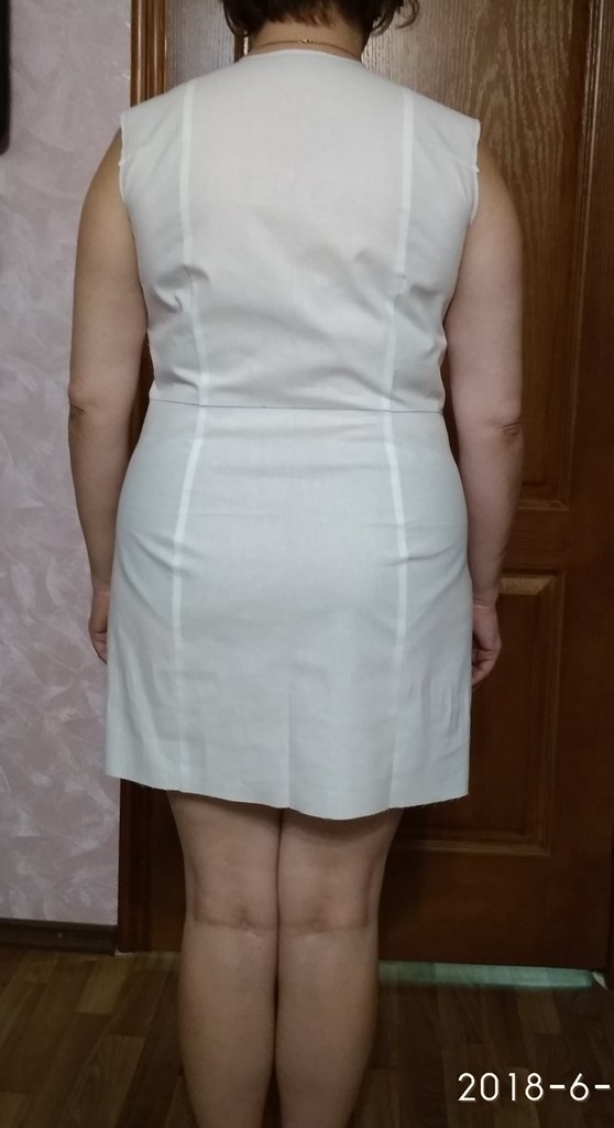 IrinaC Опубликовано 7 июня, 2018 Поделиться #2670 Опубликовано 7 июня, 2018 Всем здравствуйте! Иправляла свою облипку. Сначала распорола боковые швы от талии, пузырь на спине ушел, но плечевой шов все-же просился на 1 см на полочку.Тогда я по совету Секунды полностью распорола боковые швы, вывесила облипку на себе, плечо поставила на место, в результате боковой шов спинки сместился вверх на 1,8 см. Эту разницу я заложила в складку по типу вытачки из бокового шва. Стачала боковые швы, дав больше свободы в бедрах. Пройму на спинке я пока не подрезала. Сделала фото и выставляю на ваш суд. По ощущениям стало очень удобно. Но наверное нужно будет немного увеличить вытачку на спинке для изделия без рукава.Если это все уже неплохо на взгляд опытных портних, то я не поняла, какие изменения мне нужно учесть при следующем построении выкройки, например с рукавом, или с прибавками другими, ведь линия талии осталась на месте, по-моему сейчас она как раз горизонтальна, плечевой шов не перешивала, только увеличился раствор нагрудной вытачки, за счет этого увеличилась длина проймы по спинке. Но ведь когда строишь спинку, размер вытачки на грудь никак не влияет на построение спинки. Или я чего-то не догоняю... Ссылка на сообщение Поделиться на другие сайты Поделиться