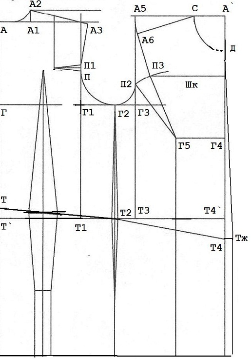 Татьяна Попова(СПб) Опубликовано 27 октября, 2009 Автор Поделиться #452 Опубликовано 27 октября, 2009 Гпр - 15,6Векса, это Вы брали Гл.пр. расчетную? Этого очень мало. Надо увеличить:Гл.пр.мод.=Гл.пр.расч. + (1...1.5)КЭто минимум.Можно для контроля промерить, например, Вб- высоту бочка- расстояние от талии до уровня подмышки.На чертеже из сообщения 465:Вб= Т2Г2Если что забыла поправьте.ДплВсе иксы и игреки. По заломам и прилеганию/свободе на разных участках можно предположить, что мерка Бхл должна быть больше, а Зх, возможно, меньше,....Расчеты (распишите подробно, подставляя значения):Sл= (Огж-От)/2=....S=(Об-От)/2=...и таблица стыковок:низ Рп Рб Рзверх Рпл Рбл Рзлразницакак Вы застегиваете облипочку? я пока четыре булавочки заколола чуть не задохнулась)Можно кнопочки пришить, например. ) Задние талиевые вытачки сделайте длиннее.Для этого полезна мерка Зул- высота лопаток относительно талии (аналогично Зу, только линейки перевернуть).При следующих фото- резинку на талию, плииииз. Преподаватель курса "Конструирование и моделирование одежды". Cканирование фигур. Построение выкроек в 3D. Моя страница ВК Ссылка на сообщение Поделиться на другие сайты Поделиться