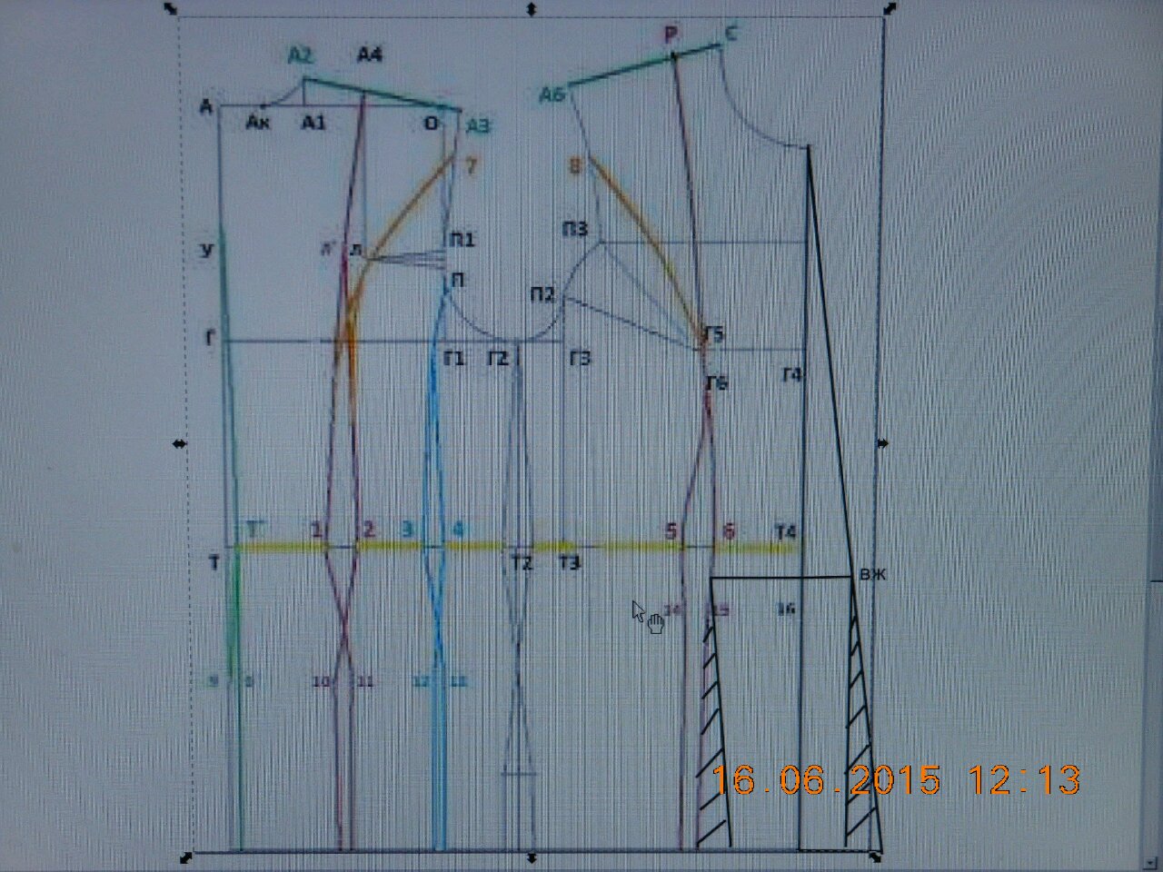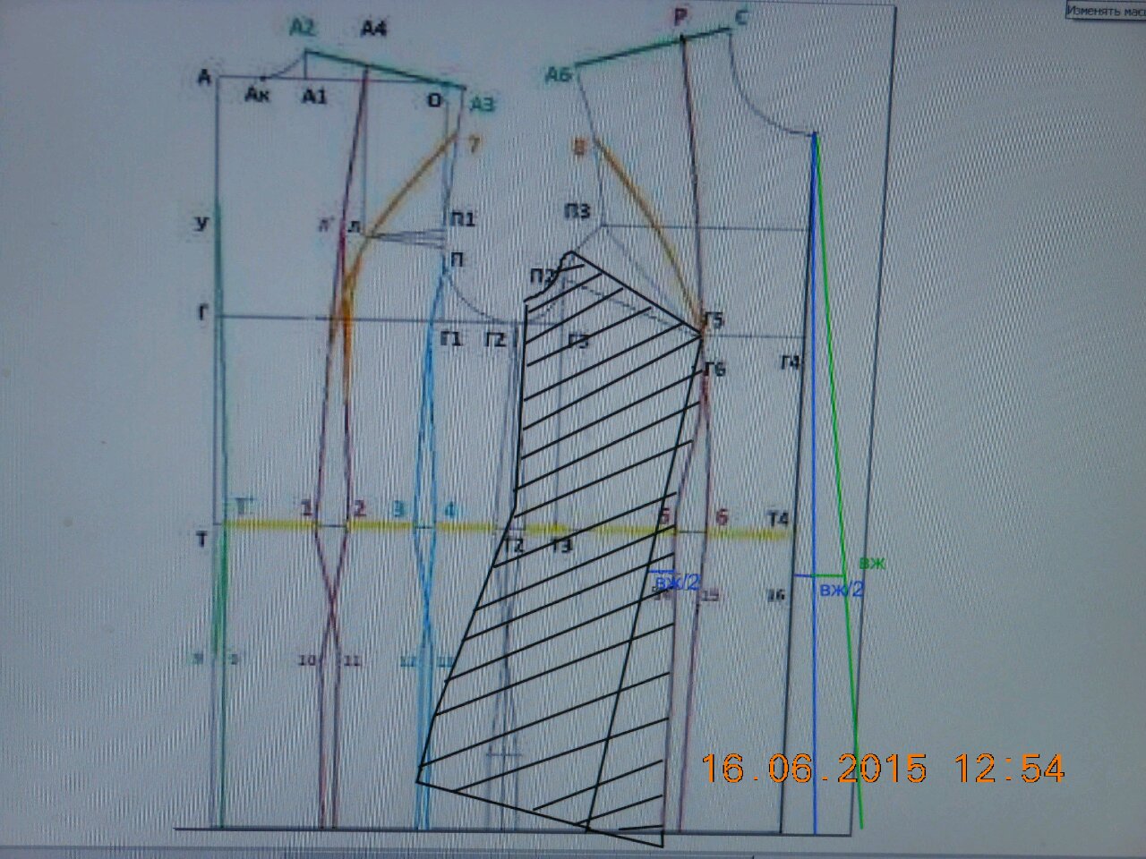 Sodem Опубликовано 1 июня, 2015 Поделиться #2090 Опубликовано 1 июня, 2015 Нет, рельефы одинаковы и на правой и на левой стороне.Наверно, невнятно обьяснила.У меня со стороны переднего бочка ровная линия, а со стороны переда (где сп) линия, как Ваша.Просто так зашилось (может ассиметрия виновата или руки:)).Но то, что добавилось по об спереди, так и просит «зашей».Я понимаю, что оценить всю картину по фото сложно.Об у меня нормальный , нигде не обтягивает.Я даже его уменьшила, потому что знала, что добавиться из– за передних рельефов.У меня вопрос: а можно сделать линию 6–15(по чертежу) и скопировать её левей (вместо 5–14) на расстоянии свободного промежутка, как бы нигде не добавляя и не уменьшая? Или так нельзя? Добавила экскиз облегающего платья.Там вроде так?А про вытачку в пройме, там мало всего к:2=1,4.Останусь без вытачки:) А она мне понадобится для рукава.Может в плече убрать? Всё, что я писала выше про рельеф, уже не имеет значения.Посмотрела в бурде и вижу, что нельзя так, как я хотела.В принципе, бывает и ровно ниже талии.Решила промерить пх под грудью и он там оказался:)! Теперь сделаю перераспределение вытачек.Думаю получиться рельеф, как у Вас на чертеже Моя тема. Ссылка на сообщение Поделиться на другие сайты Поделиться