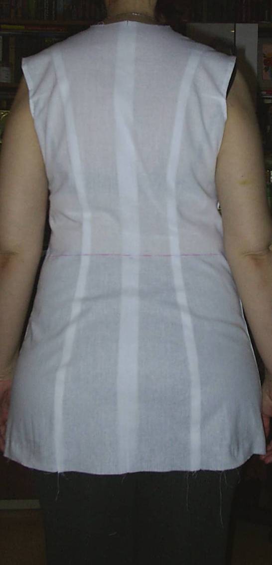 Мананя Опубликовано 23 апреля, 2008 Поделиться #212 Опубликовано 23 апреля, 2008 Пробник. Издание второе, переработанное, дополненное. Мерки ДС 43,5, Дст 40,5. ДП 46, не меняла. Выкройку построила заново с этими мерками. Все детали пробника разгладила, начертила новые линии. Потом еще измерила все длины и поперечники. Всё правильно. Вот, что получилось.Фото с подплечником:Без подплечника:Талия - синим цветом. Спинка, по-моему, осталась длинной, хотя мерки исправила - перемерила - все точно. Сама уже чертёж вдоль и поперёк исследовала и пробник - всё правильно отложено и построено. Талия негоризонтальная на этот раз отложена правильно, мерки - от нее, как и измерялись на "модели".Линии от Пу, Зу и Бу строго вертикальны на чертеже, на ткани отложены тоже вертикально, припуски на швы отложены от выкройки строго 1,5 см, откладывала всё до миллиметра. Об 115. На пробнике на уровне Бу - так и есть 115 см. А по низу измерила - 117,5 см. Откуда взялись - не пойму. Потому и клёшем выглядит. Ссылка на сообщение Поделиться на другие сайты Поделиться