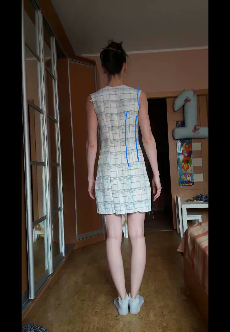 Shurochka Опубликовано 10 апреля, 2016 Поделиться #2329 Опубликовано 10 апреля, 2016 По поводу допы вытачек перед проймой. Я думала о них очеь долго. Но. Я не хочу их видеть в готовом изделии, хочу платье с рельефами по спинке и по переду. Или это невозможно с моей фигурой? И обязательно нужны эти вытачки? Это первое. Второе, я думала, как стыковать их с вытачкамт по нржней части. Да, сверху на туловище они будут скорее всего уместны, но вот надо же тогда и дальше их продлевать, на попу, а у меня на попе вместо жирка в этой области провалы (обвела синим) http://images.vfl.ru/ii/1460283659/17aad9e8/12227103_m.jpg И если в этом месте сделать вытачку, она будет "смотреть" не на выпуклость, а на ямы! Это ж не есть хорошо. Я даже по спинке, когда делала пробник юбки сместила вытачки с середины полотнища на 1,5 см ближе к центру спинки, так село намного лучше.В первом пробнике у меня явно избыток длины по спинке, поэтому уменьшила мерку длины спины, также там я пыталась убрать по среднему шву спинки, и вроде село получше, вот поэтому и мерку ширины спины убавила. А прошить в первом пробнике вытачки чуть впукло пробовала, но особо эффекта не получилось. Пройму делила в золотом сечении. Пробник юбки сейчас уже не буду фотать, тк похудела и он уже не очень прилегает. С каждым пробником надежды построить идеальную выкройку тают((( уже даже кажется это невозможным, эх... Ссылка на сообщение Поделиться на другие сайты Поделиться
