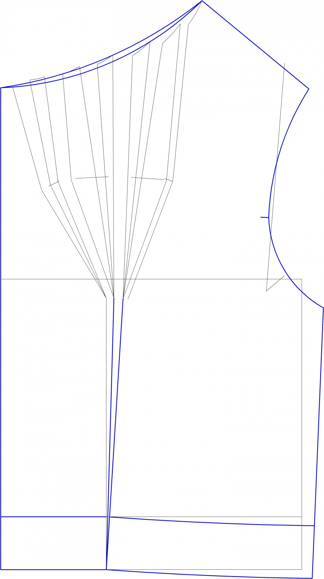Если будут складки/защипы, то вырезать именно так, как получилось. И не забыть про направление сгибов складок внутри, чтобы правильно отразить контур по верху. В данном случае можно на бумажном лекале закрыть защипы (! обратить внимание, как будет по лицу и какой стороне *лицо-изнанка* при этом соответствует лекало!) и вырезать горловину. При открытых вытачках какой контур получится, так и надо кроить.