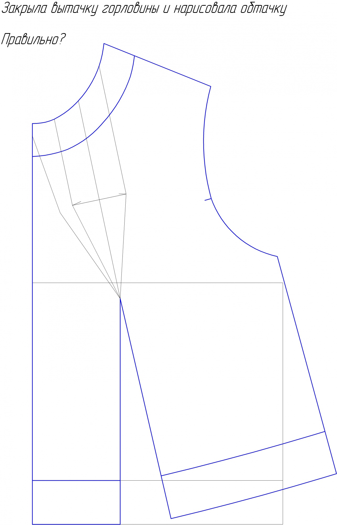 ...Существует ли правило, где четко указано, по каким точкам рисовать линию горловины после разбивки вытачки? И еще вопрос по обтачке горловины - как ее кроить? Думаю, надо закрыть все вытачки по горловине и отрисовать обтачку. Правильно?...