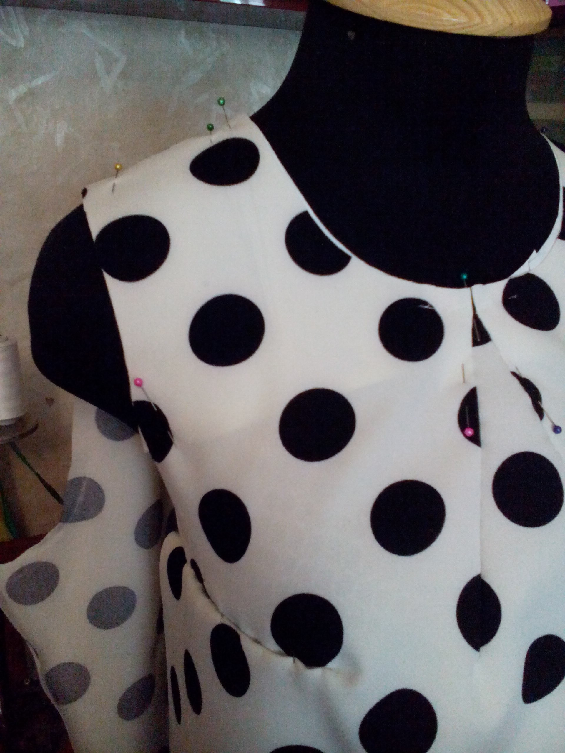 Или обтачка из основной, но подкроить так чтоб горохи были так же как на платье, если подрезка позволяет.