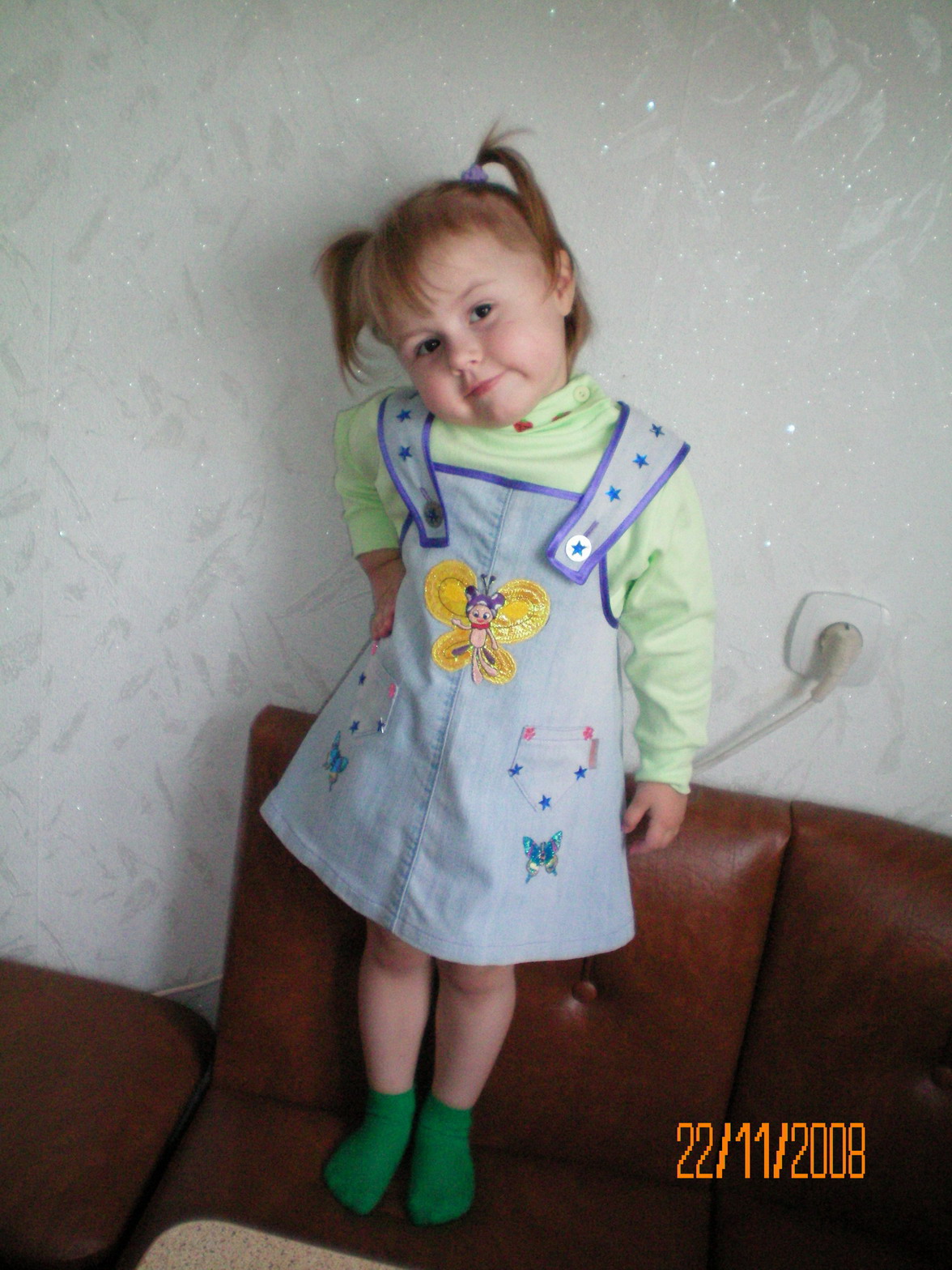 Потихоньку начинаем готовиться к осени.Сарафан в садик был когда-то дедушкиными джинсами.Вышивка машинная.Кант сделан из остатков клиентского хлопка.Пуговички обтяжные.