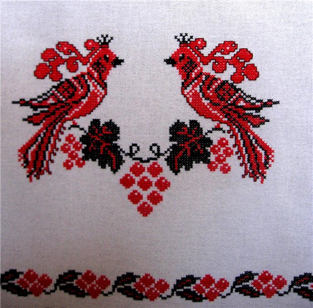 ganzya Опубликовано 21 января, 2011 Поделиться #49 Опубликовано 21 января, 2011 хочу показать вам свой рушник "Сад - Виноград"Один из самых любимых моих рушников. Я жила в частном доме с садом и виноградником. Надумала вышить рушник для своей дочери, и хотелось, чтоб он ей напоминал о родительском доме. Подобрала рисунки, где был бы виноград и калина (она росла у нас под окном) и расположила их рядами как виноградник. Долго искала птичек, хотелось необычных, красивых. Нарисовала пару и посадила на одну ветку. Рушник предназначен для перевязывания рук при венчании, поэтому старалась подбирать рисунки символично. Виноград считается символом семьи, калина защитница от дурного, а птицы, сидящие на одной ветке – крепкая семья. Кружево связала как на старинных рушниках. И еще считается что у рушников важна еще и изнанка, она должна быть чистой, последнее фото - изнанка =================================================================от модератора: перегрузила фотографии с радикала, чтобы все могли посмотреть:)) Ссылка на сообщение Поделиться на другие сайты Поделиться
