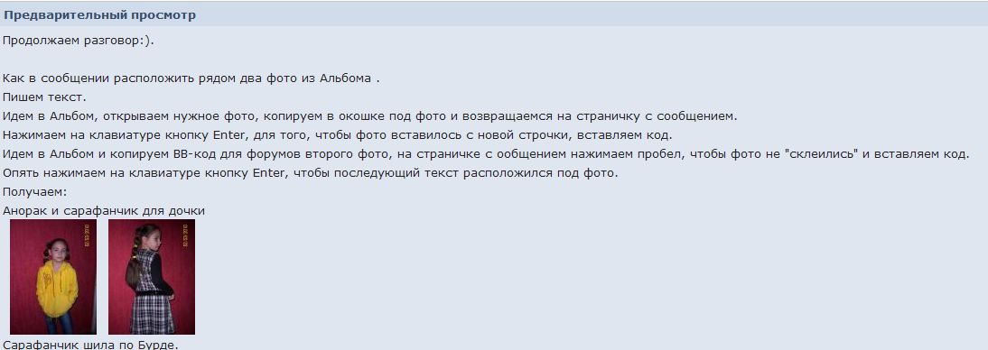 Дончанка Опубликовано 3 апреля, 2010 Поделиться #14 Опубликовано 3 апреля, 2010 Продолжаем разговор:). Как в сообщении расположить рядом два фото из Альбома .Пишем текст. Идем в Альбом, открываем нужное фото, копируем в окошке под фото и возвращаемся на страничку с сообщением. Нажимаем на клавиатуре кнопку Enter, для того, чтобы фото после текста вставилось с новой строчки, вставляем код. Идем в Альбом и копируем BB-код для форумов второго фото, на страничке с ообщением нажимаем пробел, чтобы фото не "склеились" и вставляем код. Опять нажимаем на клавиатуре кнопку Enter, чтобы последующий текст расположился под фото. Получаем:Анорак и сарафанчик для дочки Сарафанчик шила по Бурде.Если сомневаемся в правильном расположении фото, то перед отправкой сообщения нажимаем кнопку "предварительный просмотр" ( рядом с кнопкой "отправить")Смотрим, что получилосьЕсли все устраивает, то нажимаем"отправить".Не получилось- исправляем. ...ни на одной клавиатуре не существует специальной кнопки "создать шедевр"...Кетрин Айсманн. Ссылка на сообщение Поделиться на другие сайты Поделиться