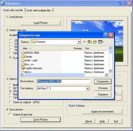 3. Откроете программу и на 1-й вкладке нажав кнопку Load Picture выберете нужное Вам фото. Ниже можно выбрать сколько процентов останеться от оригинала, если у Вас уже файлы с расширением JPEG, либо можно не менять размеры а просто чуть ниже выбрать нужное расширение (оно должно быть выбрано по умолчанию само). Только можете заранее в свойствах картинок поосмотреть их истинные размеры и ввести их вручную, т. к. там стоит обычно размер 600х450, а ваши фото могут быть и больше.