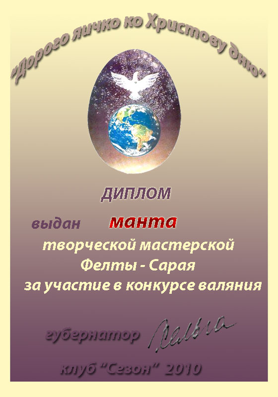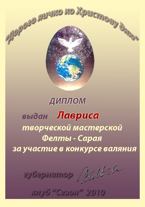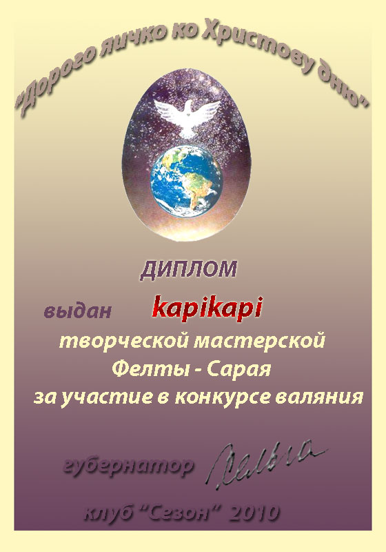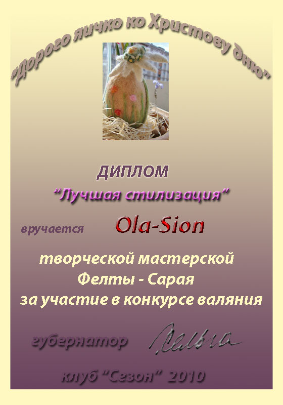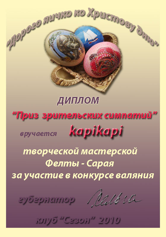 Zvezdopad Опубликовано 4 апреля, 2010 Поделиться #112 Опубликовано 4 апреля, 2010 От лица администрации клуба "Сезон" диплом за "лучшую стилизацию" вручается .... Губернатору:-)) работа №51 Всех со светлым праздником Пасхи:-)Спасибо всем за дотавленную красоту и радость , полученную от ваших работ. единственный способ жить хорошо - сразу уходить оттуда, где плохомой канал на YouTube, мой instagram, моя страница ВК Ссылка на сообщение Поделиться на другие сайты Поделиться
