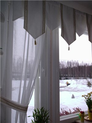 Iines Опубликовано 23 апреля, 2006 Автор Поделиться #9 Опубликовано 23 апреля, 2006 Весенняя штора готова! Уже неделя прошла, как привыкаем... Напоминаю зимнюю штору (фото получше): Вот что на основе ваших идей получилось :) Это, конечно, не гениально, зато уж точно просто, как говорится штора за вечер. Верхний край шторы проходит по периметру вырезанного квадрата, в результате шьём только подгибку - ура! Никакой подгонки клеток! Такую штору на скорую руку сделаю ещё и на окно в соседней комнате. Оно, правда поменьше, поэтому будет только три угла. Выкройка всё равно тех же размеров, только квадрат "неполноценный", что означает и выброса ткани больше. Но ничего, пустим на салфетки :)Спасибо ещё раз за помощь и весеннего вам всем настроения! Пришла нашить друзей ! Ссылка на сообщение Поделиться на другие сайты Поделиться