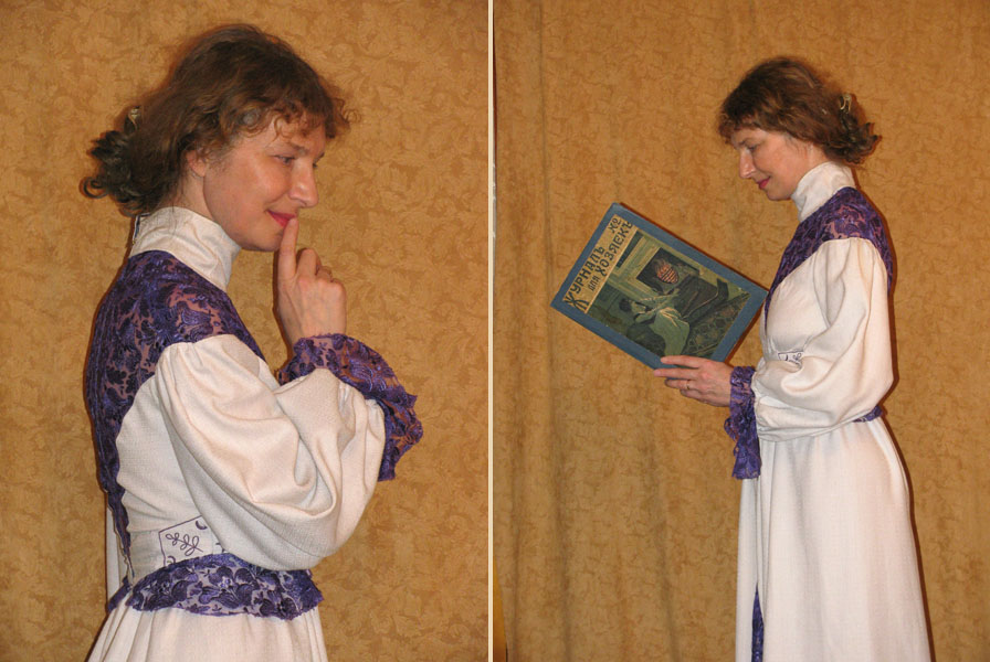 Талия здесь не завышена. Мотивы моды модерна - имитация жилеточки (она вшивная), прямая юбка без вытачек, рукав комбинированный, спереди цельнокроенный, сзади вшивной... Мелкие и многообразные отделочки: кружева крючком и спицами, ленты, нашивки... Словом, чай готов:).