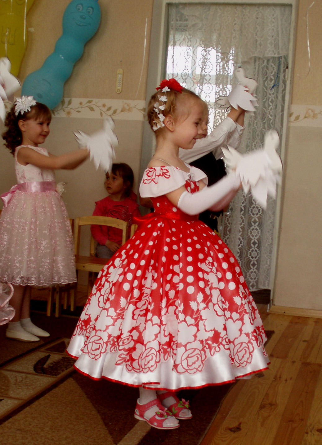 Верхний слой -шифон. По краю цветов вырезан и обплавлен. Под ним - атлас, окантованный атласной лентой. Под ними три трехъярусные фатиновые юбки. Кринолин с тремя кольцами (взрослый уменьшала в длине и объемах) пристегивается на кнопках. Подклад на лифе - бязь. В дополнение - перчатки (на фото не видно, по низу украшены маленькими цветочками), резинки с цветами сделаны из разобранных искусственных цветов. Ну и прическа)