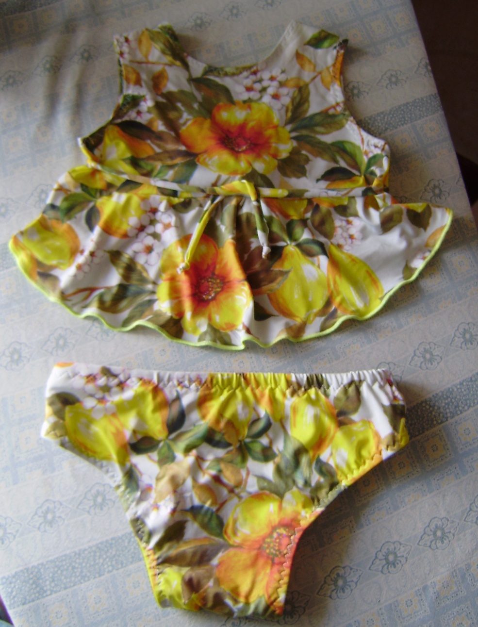 Привет всем! Принесла показать купальники для девочек. Ткань - синтетический трикотаж, тонкий, но не текучий. На подкладке трусиков - бифлекс, на подкладке верха у Алисы трикотажная подкладка. У Сони верх - кофточка с запахом и баской (что бы срятать плечики и спинку).