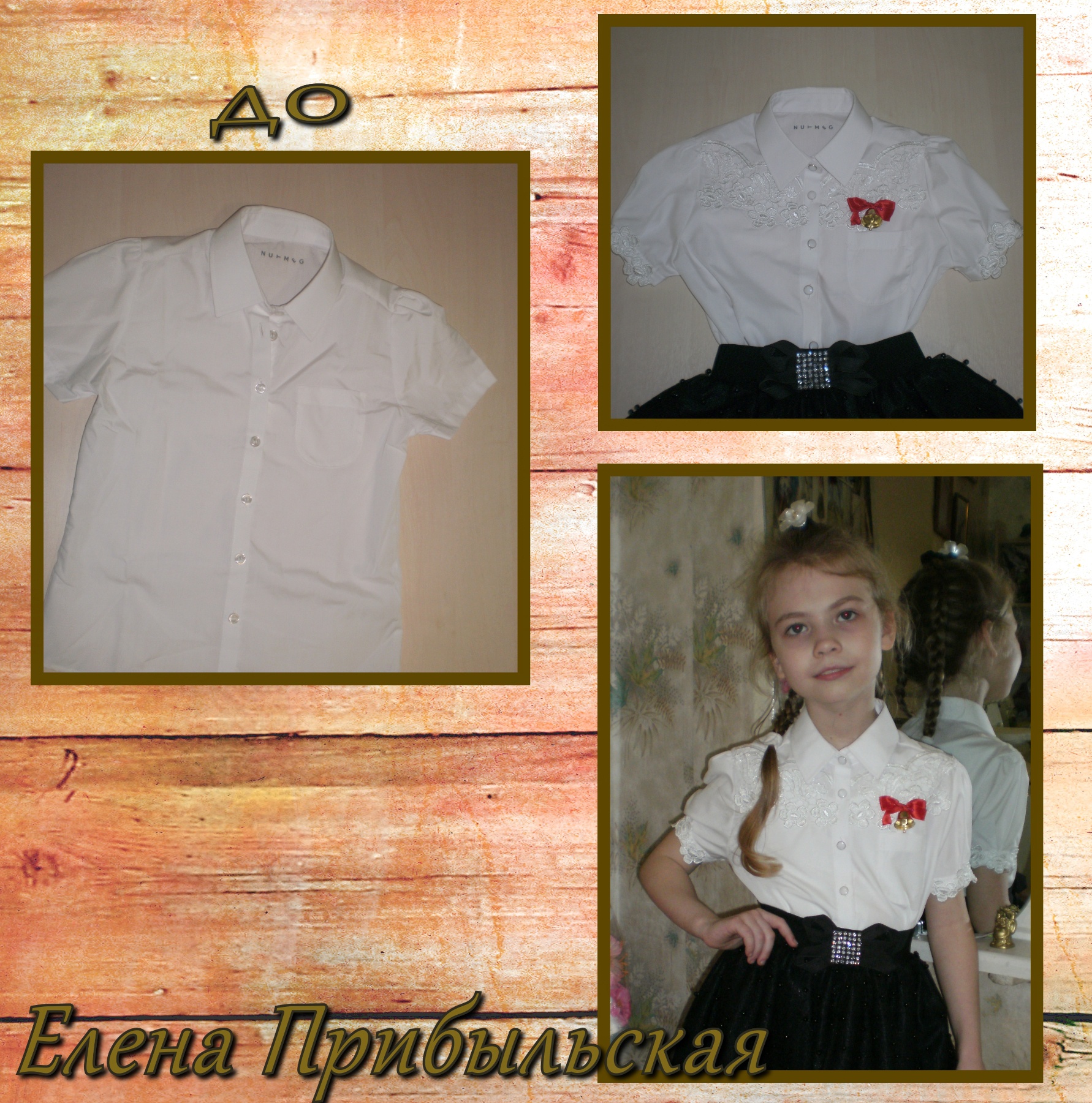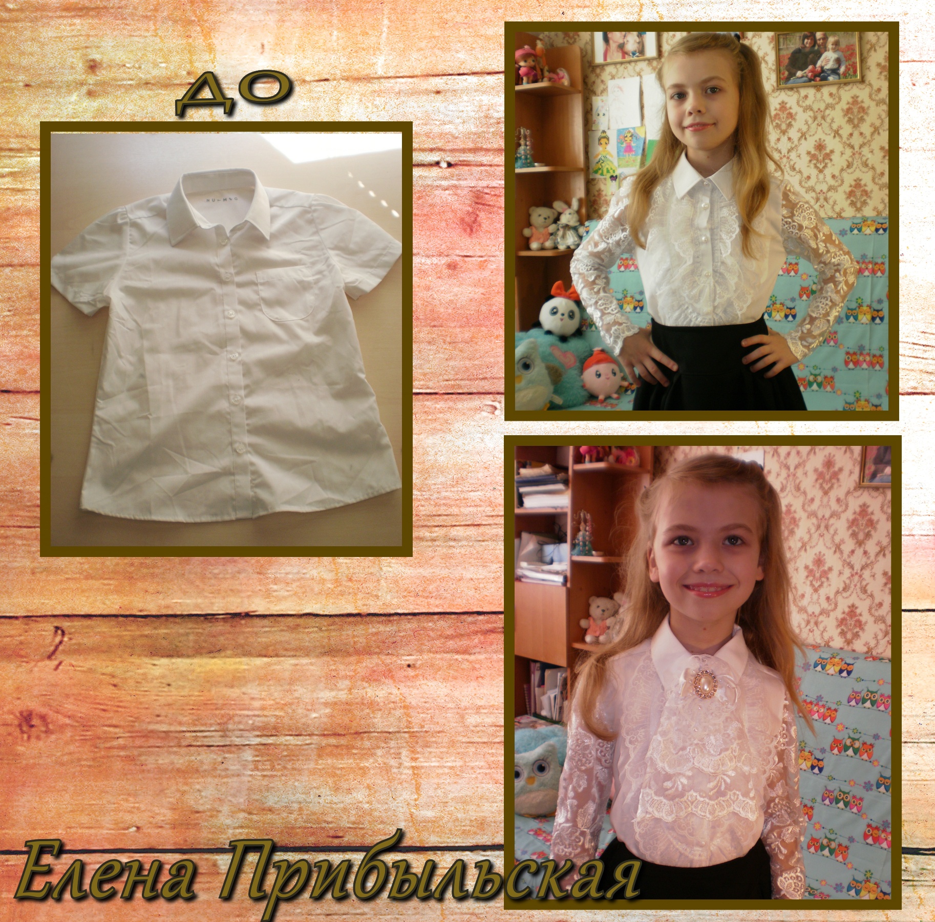 Отдельно расскажу про блузки. Как ни смешно, но купить набор из двух классических школьных рубашек оказалось дешевле, чем купить ткань для них. Поэтому решила сделать апгрейд. В первой случае ушила блузку, сделала кокетку из кружева, присобрала манжеты на рукавах и украсила их кружевом. Сменила пуговицы. Эту блузку я уже показывала раньше.