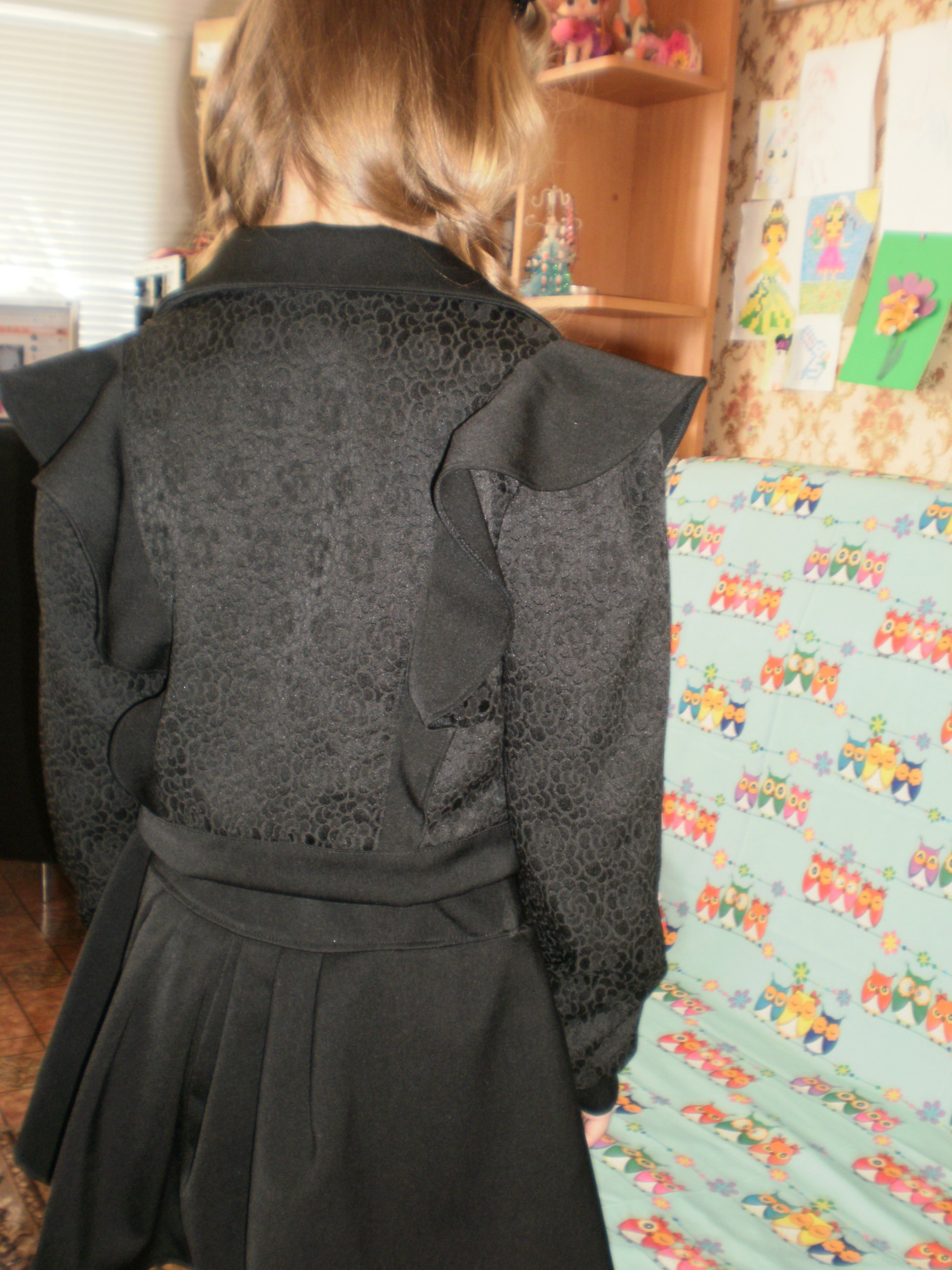 В первую очередь с Алисой мы обсудили жакет, но она призналась, что его почти не носит в школе и классический вариант ей наскучил. Поэтому мы решили объединить жакет и бомбер и сшили удобный и практичный вариант для прохлады на улице. Так как форма обязательно черная, подкладку сделала яркую.