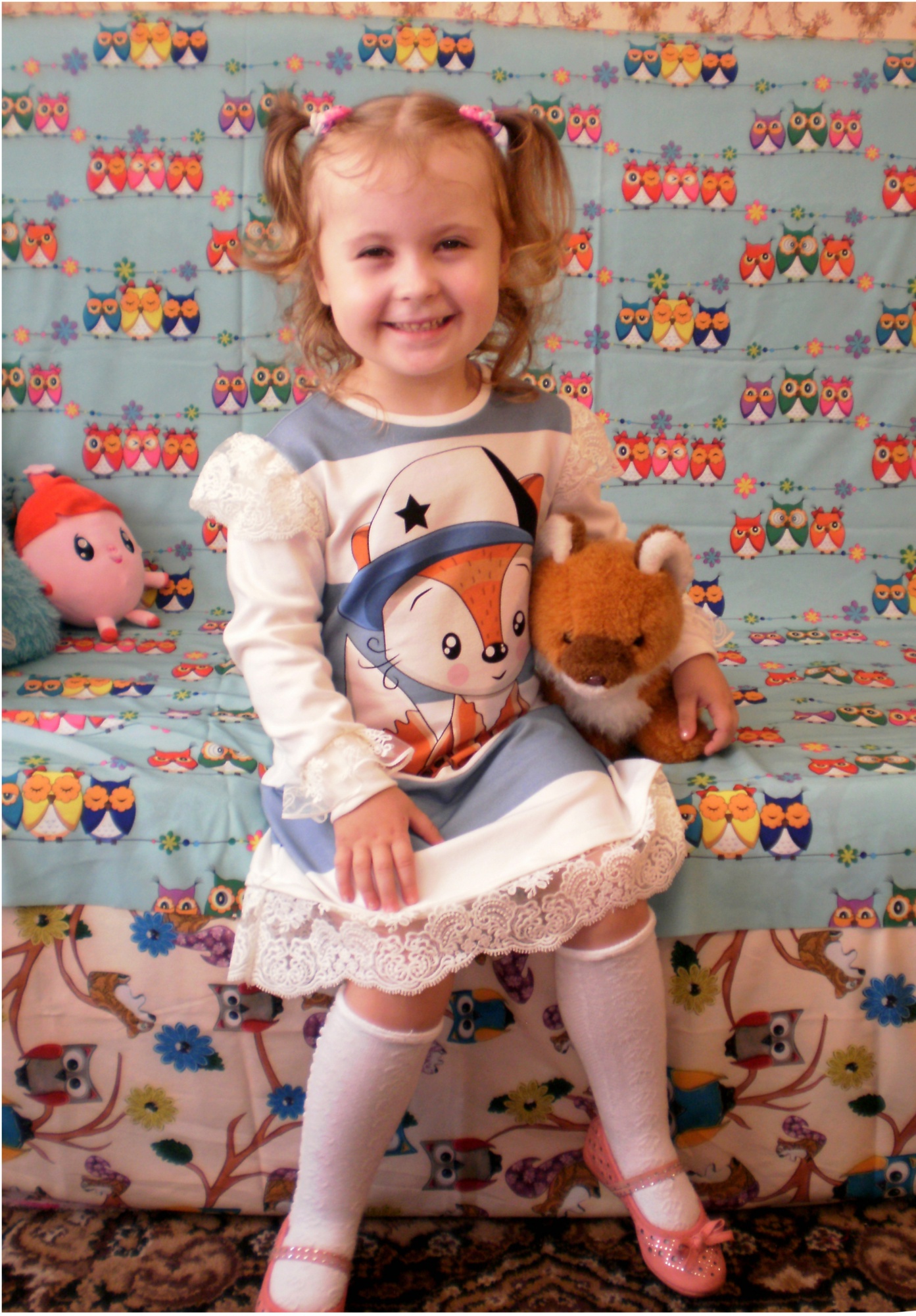 Начну с Сони. Для нее платье и свитшот из футера. Рукава из рибаны. Платье украшено кружевом.