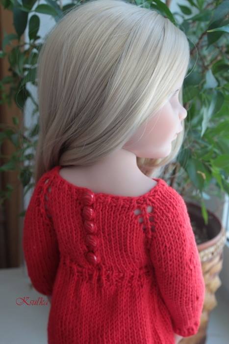 Пряжа и пуговки абсолютно те же, что и на Настасьином платье. Вот пришивной каймой пришлось пожертвовать, всё-таки кукла почти в 2 раза ниже ростом. На спине по реглану просто дырочки пустила, а не ажур. И еще помпошки заменила на кисточки с деревянными бусинами. Повзрослее платье вышло. И, пожалуй, больше рустикальности. Ну дак и кукла не полуторагодовалая малышка :-)