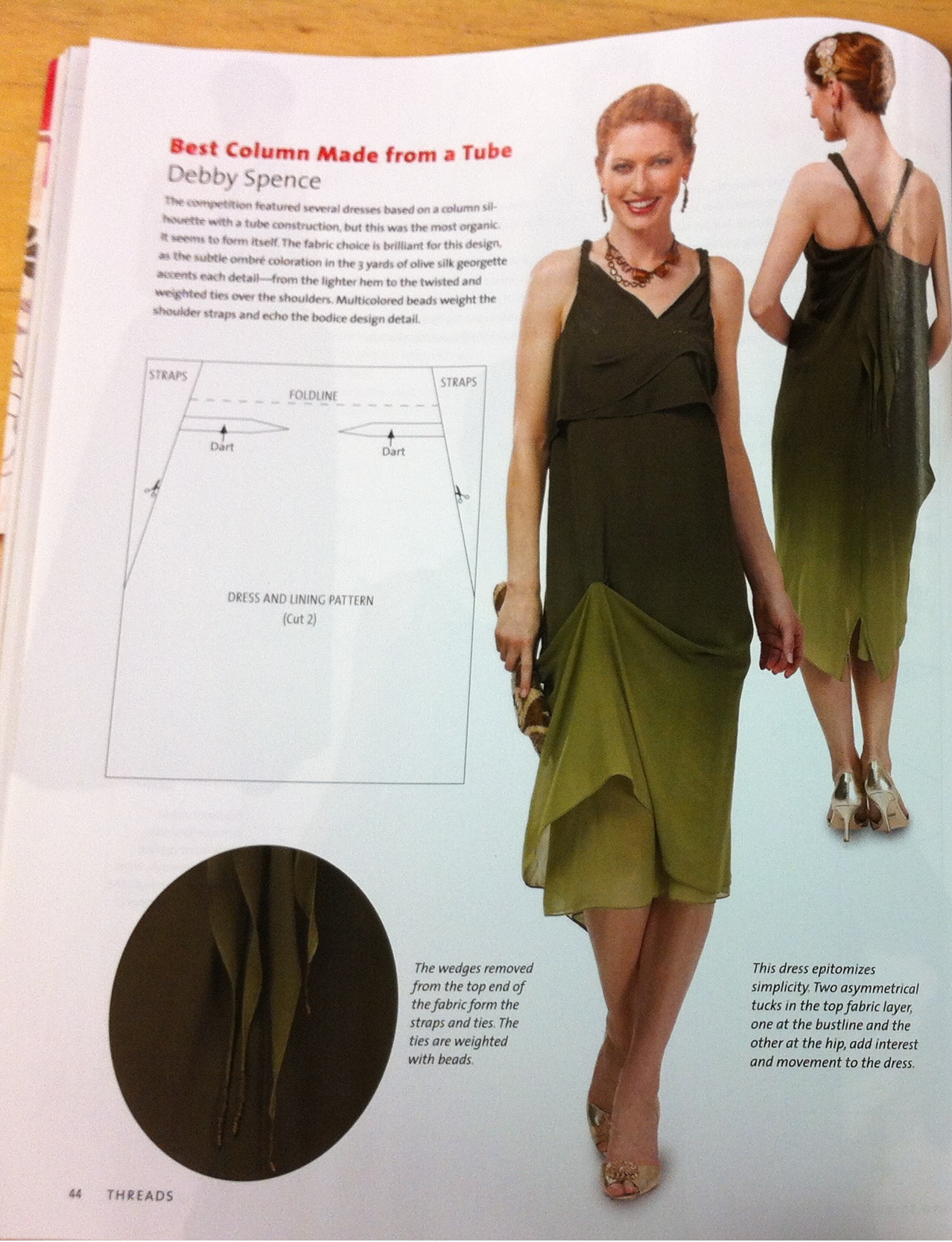 Я вам нашла подходящее платье из купона. Это статья из журнала Threads, там показано шифоновое двойное платье из прямоугольника, на котором потом застрочены зашипы и по переду, и по оборке, для создания асимметричной модели. Если вы сошьете это в один слой трикотажа и без оборки по лифу из вашего трикотажного купона, по-моему, выйдет тоже очень красиво.