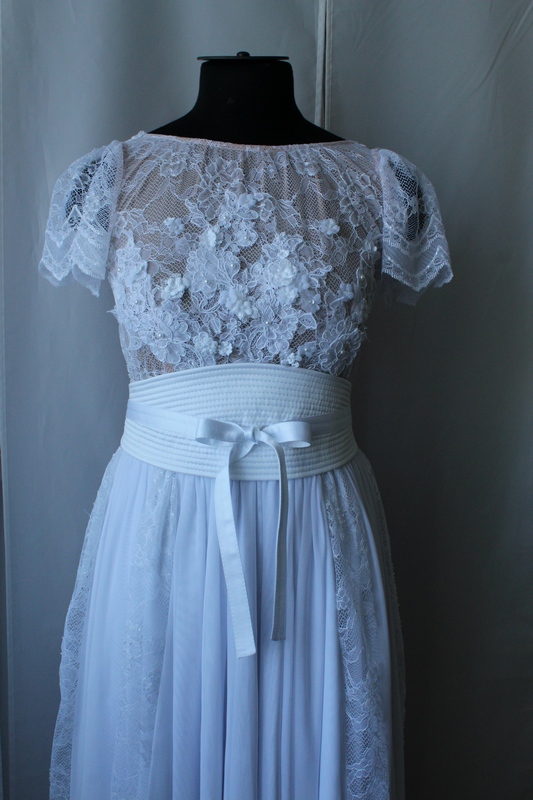 Аленка 84 Опубликовано 5 июня, 2013 Автор Поделиться #1026 Опубликовано 5 июня, 2013 Всем доброго дня! Нахвалили меня, сижу краснею))) Работы на сегодня запланировано не мало, так что положительный настрой очень даже не помешает, тем более в том бешеном ритме, который у меня сейчас присутствует до конца лета. Спасибо за заряд позитива с утречка, тааак приятно!Ну а теперь, как обещала, немного подробностей последнего платья и ФОТКИ-ФОТКИ!)))Итак, платье должно быть под стать месту проведения свадьбы. Соответственно корсетные варианты и прочие элементы помпезности мы не рассматривали вообще. Итак, тонкое, но стабильное кружево, 30см бежевого шифона гарден (чего только стоило найти нужный беж), сетка-стрейч и шифон стрейч на нижние юбки (их я сделала 2, но по факту можно было и одной обойтись) и итальянский атлас на пояс. Вот такое намешанное содружество материалов))))Кружево и бежевый шифон собирала как один слой, лиф без подкладки. Плечо укорочено и эти сантиметры перешли в рукавчик. Рукав втачной, без шва, сходит на нет в нижней части проймы, со складками по окату. Горловина и проймы окантованы косой из органзы.Юбка - 12м стрейч-сетки - 2 слоя по солнцу со сборкой(тяжееелая получилась юбка, но клиентке не нравился шифон, да и пластика у него другая). Верхний слой разрезан по вертикали для притачивания 6 кружевных полос (по 2 спереди, сзади и по бокам). Нижние слои из шифона по полусолнцу. Платье на молнии, молния втачена на юбке в шифоновый слой, в слоях из сетки - разрез (2 слоя обтачены между собой).Пояс продублирован, проложен синтепоном и обтачен тем же атласом. Настрочены отделочные строчки, утюжка с осторожностью, чтобы не потерять объмность синтепона, пара по минимуму. Лента с бантом (из той же ткани) настрочена поверх. Застегивается пояс на 3 жемчужные пуговки. Застежку делала в последний момент, припуски обтачала кружевом и подшила вручную, так как толщина была уже приличная, если обтачивать чем-то другим. На платье и пояс пришивала кнопочки по боками и сзади, чтобы пояс не смещался вверх. Ссылка на сообщение Поделиться на другие сайты Поделиться