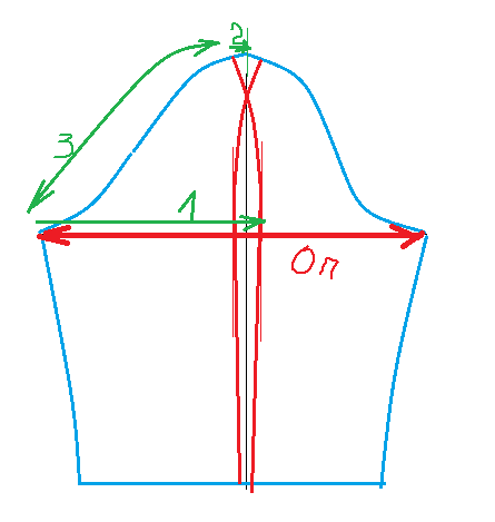 Тогда нужно перемерять ОП и при необходимости добавить нужны см , откладывая их от середины рукава в стороны (на картинке зеленым № 1). Сколько-смотрите сами по качеству и элластичности ткани и прибавке. У больше 4-5 см на рукав прибавку не делаю, то есть ОП + 4 -5 см итого.