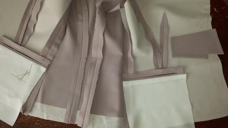 Сама основа не дублируется, только утюжка по швам, оттянуть по ним, чтобы лежало красиво, мягко, а дублируется мягким дублерином только нижняя часть воротника.