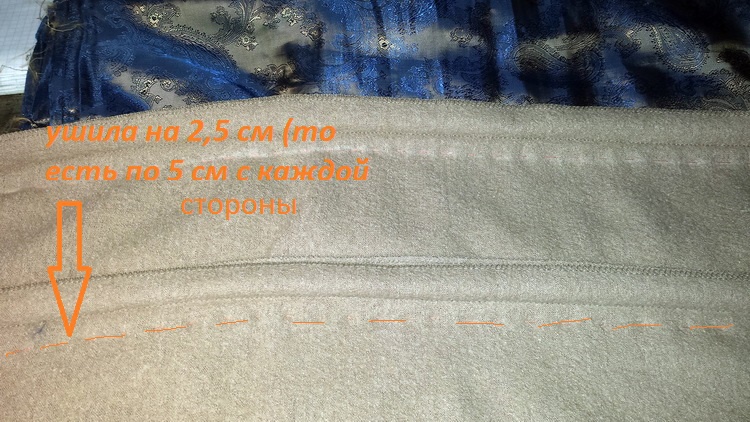 А в ширину....10 в первый раз. Так как ушивала по 2,5 см с каждой стороны х 2. То есть по 5. ТО есть итого 10. Потом еще растянулась.
