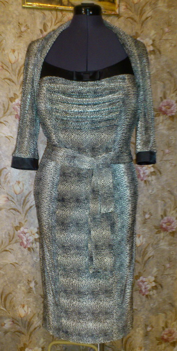 Немного внесла изменения в длины переда, спинки, уокротив их немного, а так село просто идеально и я ничего не меняла в выкройке вообще, ну, кроме как слегка заузила к низу и добавила отделку из черного шелка (проклееного дублерином, конечно) , сделав более четким вырез, добавила отделку на манжеты, и сотворила длинный завязывающийся пояс, чтобы все вместе в платье заиграло. А то было какое то "серое" и недоделанное. Бантик на груди съемный)))