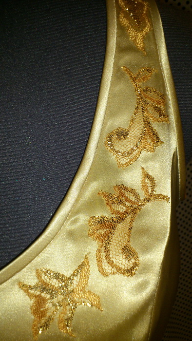 В платье расшиты верх по горловине, втачной пояс и низ. Ушивала по поясу, распоров рисунок с боков, а потом наложив его обратно. Оказалось, совсем несложно и даже увлекательно. Теперь я понимаю людей, занимающихся вышивкой бисером, бусинками и каменьями - это интересно, увлекательно и просто здорово видеть, что у тебя в итоге получается. На фото Лицевая и изнаночная сторона, на которой все чисто и аккуратно вышито одной нитью - думаю, что начинающим вышивальщицам это может пригодиться.