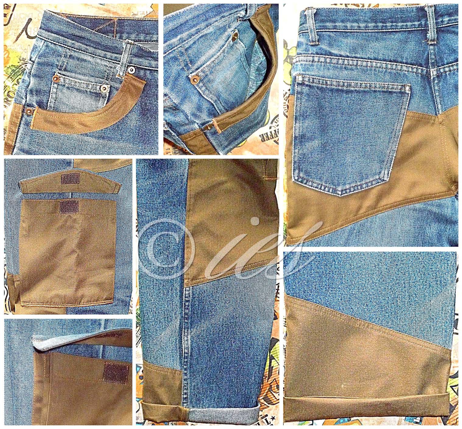 ies Опубликовано 18 апреля, 2016 Автор Поделиться #30 Опубликовано 18 апреля, 2016 (изменено) Любимые джинсы превращаются... Жили-были любимые покупные джинсы сына из классной плотной джинсы, классического покроя, 5 карманов. Носил их в хвост и гриву: обтрепались низы штанин и карманы(((. Выбросить не дал. Но и носить, как есть, уже нельзя. Достала я лоскут цвета хаки из очень старых запасов, предложила переделать: сделать накладки на карманах и вставки на коленях спереди и на попе и внизу сзади, пришить любимые карманы-почти-портфели с липучками, как на брюках карго. Джинсы разобрала почти до основания, выкроила вставки и карманы, остатки от выпадов джинсы пошли на клапаны (нижняя сторона - хаки). Попутно быстро сшила ветровку с капюшоном и "хитрыми" карманами: снаружи - обычные в рамку на молнии, а внутри - дополнительный карман для телефона и других немелких "мелочей". Крой - самый примитивный, без кокеток и рельефов. Вот что получилось: Изменено 18 апреля, 2016 пользователем ies Все в наших руках, поэтому их нельзя опускать (Коко Шанель)Мой Pinterest Ссылка на сообщение Поделиться на другие сайты Поделиться