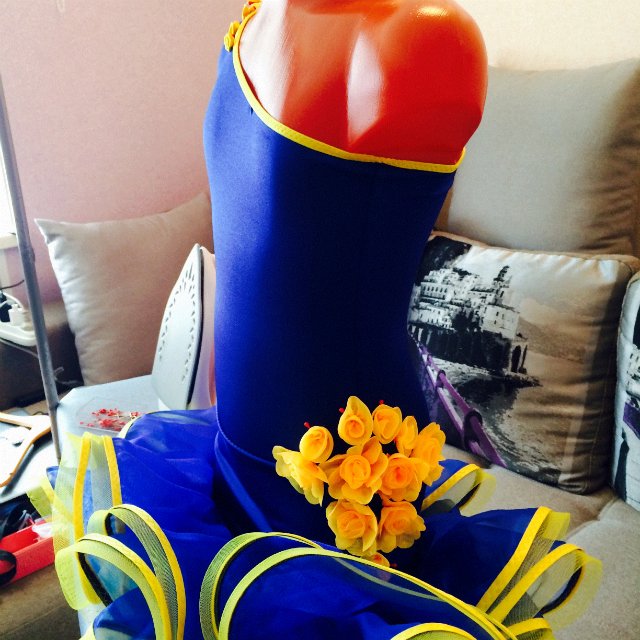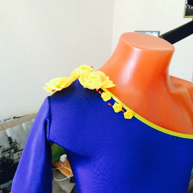 Посоветуйте, пожалуйста, как все таки расположить цветочки? Склоняюсь от маленьких отказаться, и сделать еще из органзы среднего размера. Ребенок просит желтый пояс на талии, но тренеру нужно чтобы мы вытянулись, партнер выше, думаю все таки пояс нас "перережет" пополам.