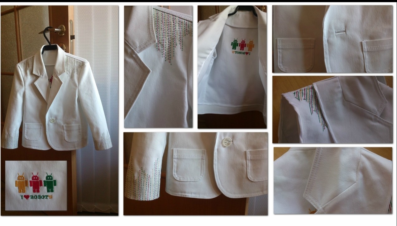 Строчка Опубликовано 15 марта, 2015 Поделиться #341 Опубликовано 15 марта, 2015 Новый опыт от Sweety-Lana.цитирую:Маленький пиджачок с вышивкой (для мальчика 6 лет).Мальчик обожает роботов и мама его показала рисунок, какие роботы должны быть.Ясное дело, создавать дизайны машинной вышивки я не умею, поэтому пошла лазить по разным сайтам...Что хочу сказать. Ничего похоже я вообще не нашла!!Убила на поиски 2 дня. И решила, что возьму и сделаю сама!Сказала, так сказала. Но самое интересное, что и сделать тоже получилось ))) Причем буквально за несколько часов. Разумеется, те, кто создает сложные дизайны посмеется нам моим шедевром, но я рада, что получилось - раз! дизайн как на картинке клиентки - два! Еще из украшательств этого пиджачка - ручные разноцветные строчки. Вышивалось почему-то долго, но бесконечно приятно.Петелька обтачная, пиджак без подклада (тоже пожелание клиентки), поэтому открытые срезы обработаны с бейкой. Выбрала белую, т.к. все остальные просвечивали. Альбом Sweety-Lana. Захотела и сшила...делов-то!====================Мастерская Строчки... Мы с Котами в ИнстАграме. Ссылка на сообщение Поделиться на другие сайты Поделиться