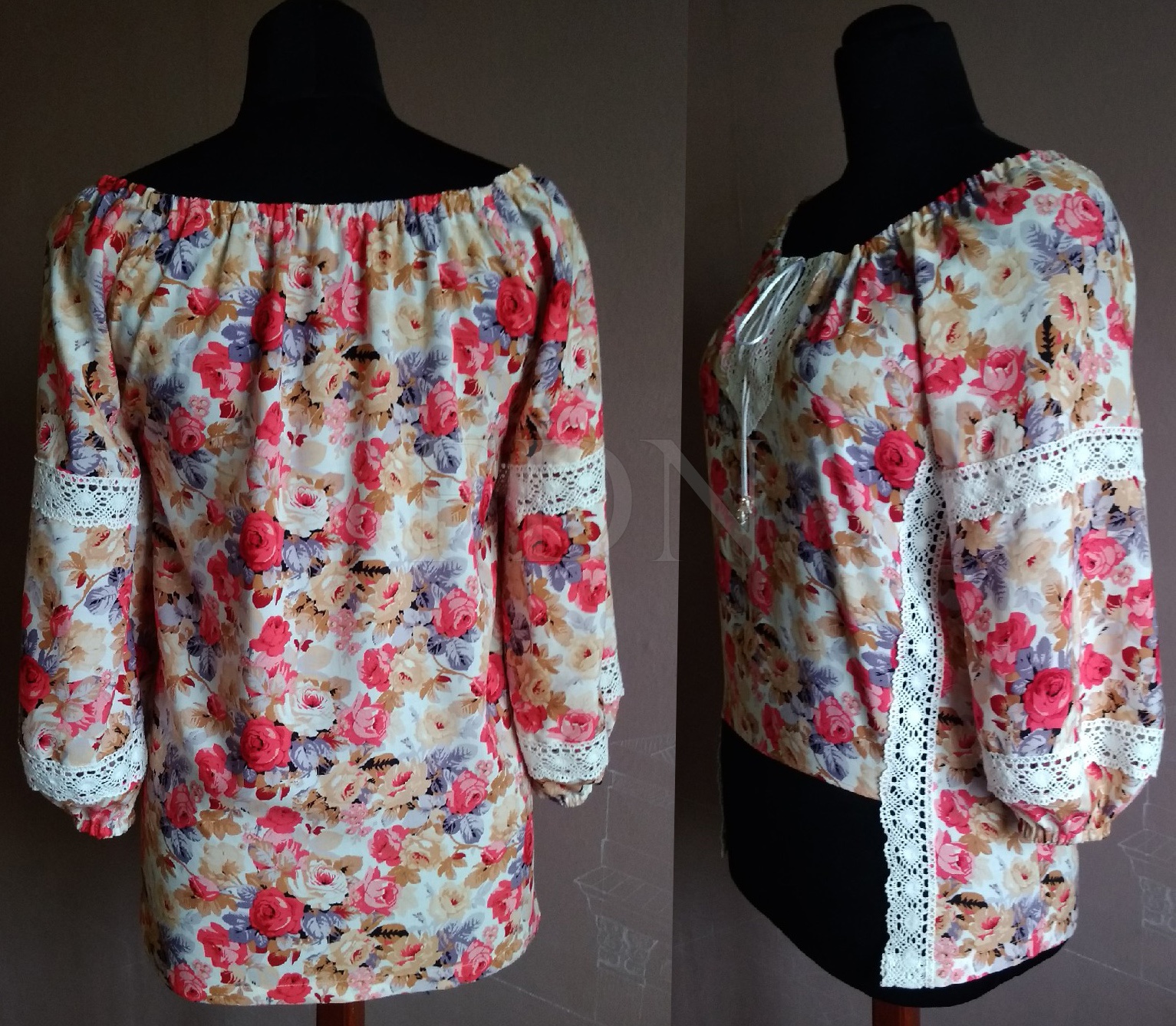1. Блузка из штапеля. Чтобы структурировать яркий принт добавили хлопковое кружево.Клиентка на 3 размера изящней манекена)