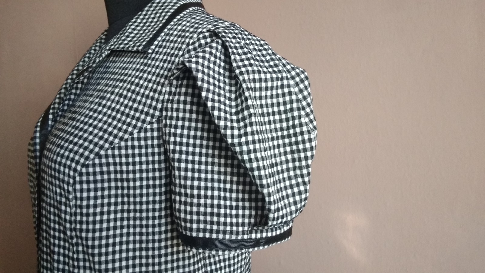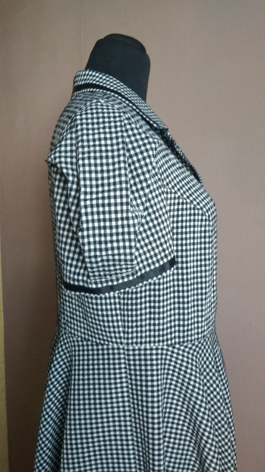 Юбка-солнце хорошо скрывает фалдами небольшой живот, платье 54 размера, манекен 48. Клетку по возможности совмещала на боковых и среднем шве юбки и лифа.