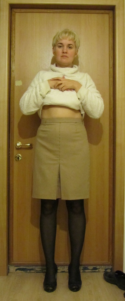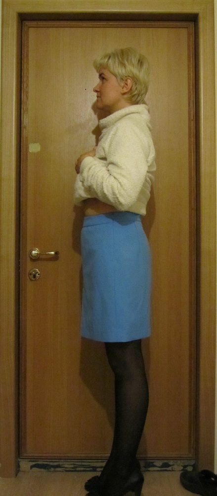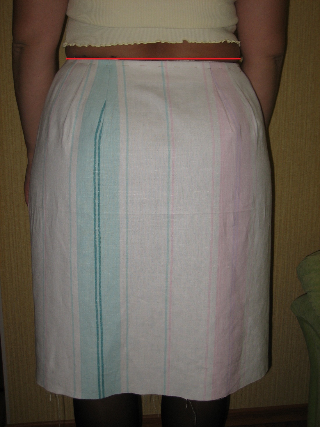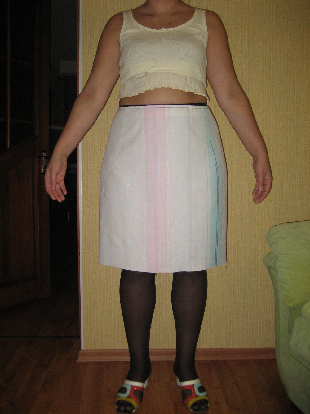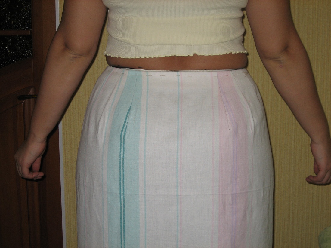 Лиля Опубликовано 25 октября, 2012 Поделиться #648 Опубликовано 25 октября, 2012 Добрый день всем!!!Выкладываю пробник юбки с изменениями: увеличена длина юбки сзади на 3 см, растворы вытачек пересчитаны с учетом "булочки" сзади, увеличен Об на 2 см. . Разница в длинах Дбл и Дз 110 и 108,5 соответственно. На примерке уточнила Дбл=109 и Дбп=108 (откорректирую), но все равно как-то странно. Раньше такого не было, длину брала одинаковую 109.. Такое ощущение, что юбка "завалена" на один бок...При ходьбе юбка не ползет вверх, но ощущения такие, что нужна будет подкладка для скольжения ткани, так цепляется за колготы (ткань средний лен). Дз думаю надо брать не 3, а 2,2-2,5 см. Пояс на примере опять чуть потянулся, несмотря на несколько строчек, поэтому откорректировать четко талию было не просто-(кажется спереди чуть провисает).Вот теперь вопрос - что делать с таким числом вытачек (спереди 4, сзади 8)? Думаю, при моделировании без широкого пояса (около 5 см, кокеток) и рельефных швов спереди и сзади не обойтись...А Вы как считаете? С нетерпением жду критики!!! Ссылка на сообщение Поделиться на другие сайты Поделиться