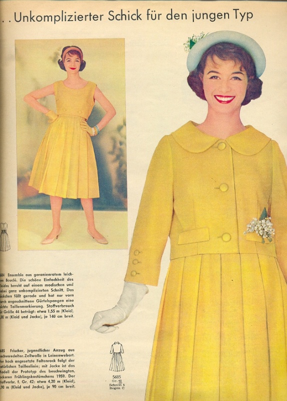 Ksul'ka Опубликовано 4 октября, 2010 Поделиться #2589 Опубликовано 4 октября, 2010 Действительно, Ксюлька совершенно права, это поздний НЛ, начало 60-х.Лиф остаётся по-прежнему женственным, но мода избегает в нём сложных линий. И это тоже девичество, в милой простоте кроя.А главное - юбка стала короче.Поэтому она выглядит растопыренней, силуэт юбки более круглый, даже бочонок.Чтобы уравновесить это укорочение, лиф перестали удлинять, и ЛТ на естественном месте.Так что это просто классическое платье самого начала 60-х.дабы мы с Фросей не были голословными, да и вдруг кому-то захочется повторить эксперимент La_femme, покажу несколько картинок из 1959го года:юбочки клешатся очень по-разному: и ярусные, и откровенные бочонки, и даже совсем сдержанный клеш. мне особенно понравилось платье с юбкой-баллоном со следующей картинки (у меня есть платье с НЛ-воротником и баллоном, но юбка гораздо уже, только намёк на ту эпоху):и очень удивила настолько полезшая вверх талия, я даже перепроверила, что выкройка не относится к разделу одежды для беременных: отвергаешь - предлагай! Ссылка на сообщение Поделиться на другие сайты Поделиться
