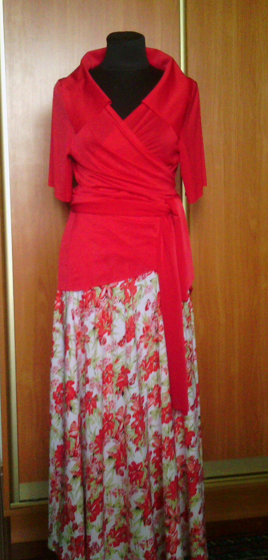 С наступлением тепла пришло огромное желание шить наряды для себя.Сшилась длинная юбка в цветы,к ней захотелось ярко-красную блузочку с запахом....ага,и пошло,красные босоножки,красная сумочка были куплены.Блузочка великолепно подошла к моим любимым брюкам,не плохо и с черной юбкой,несколько лет назад сшитой.А в пятницу сшила и укороченные брюки в каллы...они не только укорочены,но и без боковых швов,без застежки и на резинке....быстро-брюки за час.