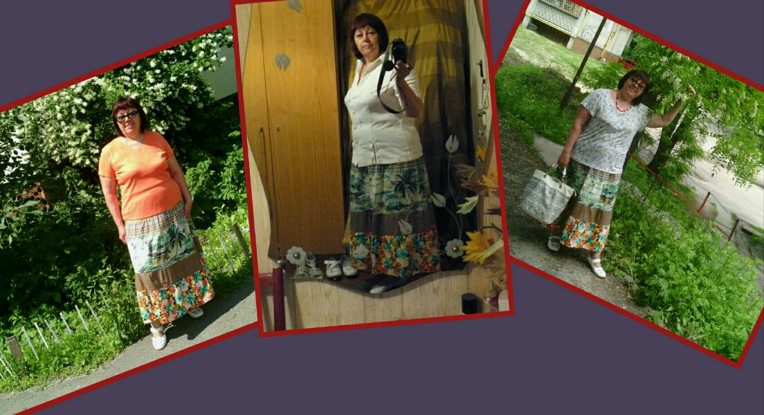 Пляжно-прогулочная юбка,назвала ее сумасбродная.Шилась она очень интересно,путем набора...оторвала верх от куска ткани,прикладывала следующий отрез,примерялась...отрывала,пришивала и так до конца.Затем один шов по средине сзади,на резинку и юбка готова