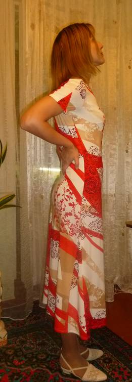 еще одно с очень интересным рисунком,тоже нагрудная переведена в бок,по талии выточки,по плечу вставлена белая полоска,выкроенная из кромки этой же ткани.И когда платье было готово,Лена пожелала расширить к низу.И я по ее просьбе в бок вставила клинья,выкроенных из остатков.