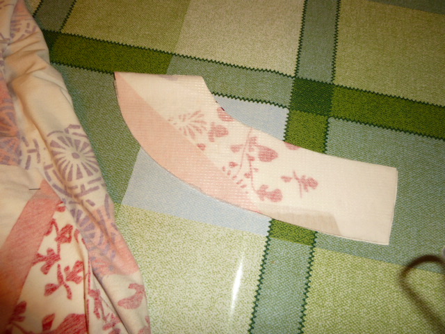 и немного процесса...обещала я как показать как выкраиваю обтачку по горловине по готовому изделию,выкройки нет с моделированием,ведь все прямо на ткани делаю.После как покроила детали платья,из остатков выкраиваю подкройные с запасами и из флизелина,под утюг.У платья стачаны плечевые швы,складываю вдвое линию горловины,совмещая плечевые швы,скалываю булавками и уже окончательно выкраиваю обтачки.