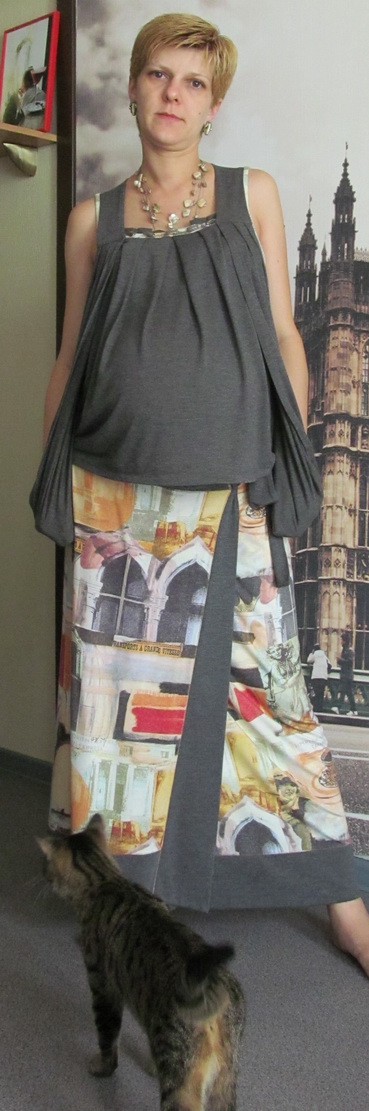 Уже не помню сколько валялся у меня кусок вискозки трикотажной,которую я в жару,будучи дома, просто вокруг" пятой точки" наматывала.Ну и наконец-то,дошли ручки до неё - юбка с запАхом,с отделкой из серого трикотажика.ДЛя нонешнего положения - безумно удобная весчь.Ну и соответственно верх к этой юбке из того же серого трикотажа))И платьицо купонное из трикотажного джерси,тоже с отделкой компаньоном - носилось с леггинсами месяцев 4-5 назад))так что сейчас только на манекене))