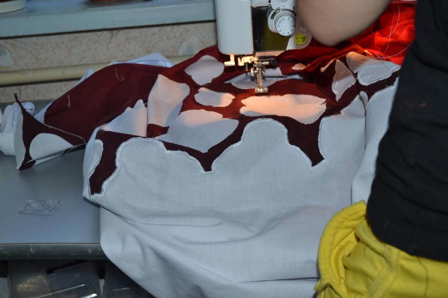На красном кимоно племянница сделала градиент черным цветом. Первое кимоно мы испортили. Но зато второй раз получилось не плохо. градиентом дело не кончилось. Надо было пришить много белых цветов! Дело тоже не сложное, но муторное! А машинка одна.
