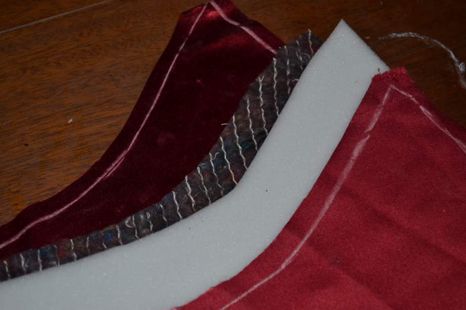 Складываем внешние части вальтрапа ( атлас) лицевыми сторонами внутрь, потом паралон и ватин. Следим чтобы верх вальтапа после выворачивания оказался над паралоном!