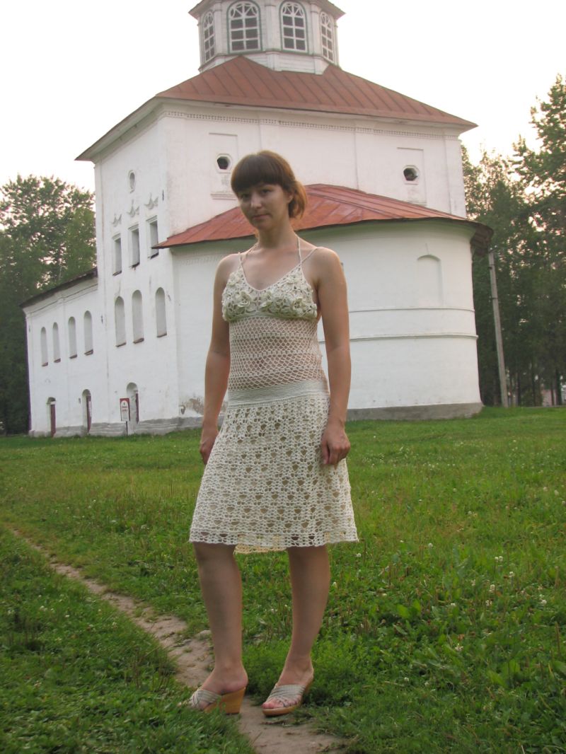 Алён4чик Опубликовано 26 октября, 2010 Поделиться #9 Опубликовано 26 октября, 2010 Решилась показать свое платьюшко-сарафан. Название у него достойное - "Сборная солянка" (присмотревшись, в нем видно, что подол от всем известной туники(платья) от Прада, серединка от каталожного платья, которое тоже на вязальных форумах частенько мелькало, ну а верх - верх стандартный - из элементов (в данном случае цветочки с лепестками, пусть хоть чуть-чуть, но будет эффект увеличения хруди, эх-хе)Ниточки лен с вискозой (Пехорка), ушло 2,5 моточка. Подклад - 100% вискоза бледно-золотистого цвета.Вязалось на редкие теплые северные денечки (пошиковать :) Но лето подарило бесконечное кол-во жарких дней, и платье не снималось.... очень легкое, к телу приятное, плюс я носила его без бюстика, и никакие лямочки нигде не спадали и не натирали... опять же в жару - только плюс!!! простите за качество фото... на фотографии, где вид спереди, сеточка отстает от тела, на самом деле при движении сетка повторяет контуры тела и выглядит не так уж и плохо...что-то все фото перепутались... /*от Ksul'ka: объединила все фотографии в одно сообщение.*/ Мой никнейм - нелепая случайность. Я - Алёна :) Моя детская тема. Ссылка на сообщение Поделиться на другие сайты Поделиться