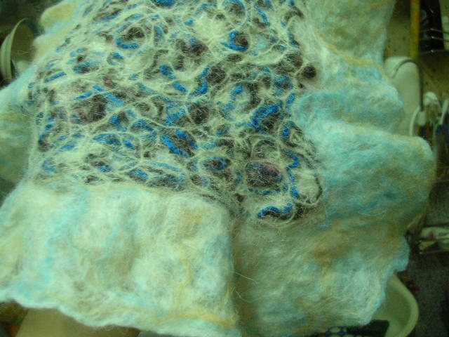 Lena Di Опубликовано 21 апреля, 2008 Автор Поделиться #167 Опубликовано 21 апреля, 2008 Это мой последний (вчерашний), но первый в технике "крези" плюс полукапуста". Сначала изготовила крезиевую часть - на авалоне раскладывала, как стих ляжет, слой белой альпаки, потом коричневый буклированный мохер, потом голубую вискозу, потом еще альпаку - и строчила шелковыми нитками. Поскольку опыт был первым, раскладка оказалась жидковатой, и я с одной стороны подпушила ее прядками шерстки. Слегка поваляла. Потом долго смотрела на результат не понимая - то ли порезать на воротник и манжеты, то ли... В результате приваляла капустную оборку. В результате всех манипуляций крези-фактура стала более плотной - какой и хотелось:) Главное, чтобы костюмчик сидел! Ссылка на сообщение Поделиться на другие сайты Поделиться