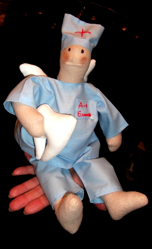 Доктор -что надо !!!!! В меру упитанный.И зуб у него в руках!!!!! Отличная придумка .А про то как я делаю рукавчики куклам я покажу скоро.Как только буду шить очередную куклу.