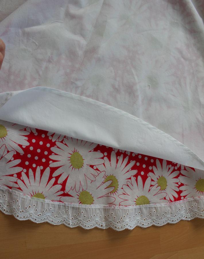 т.к. поплин и юбка вообще довольно тяжеловаты для такоговерха- при стачивании верха и низа я подкладывала ленту тканную ,ХБ, чтобы во-первых не было видно проколов иглы, во-вторых не разорвало ткань от тяжести юбки:-)