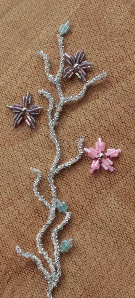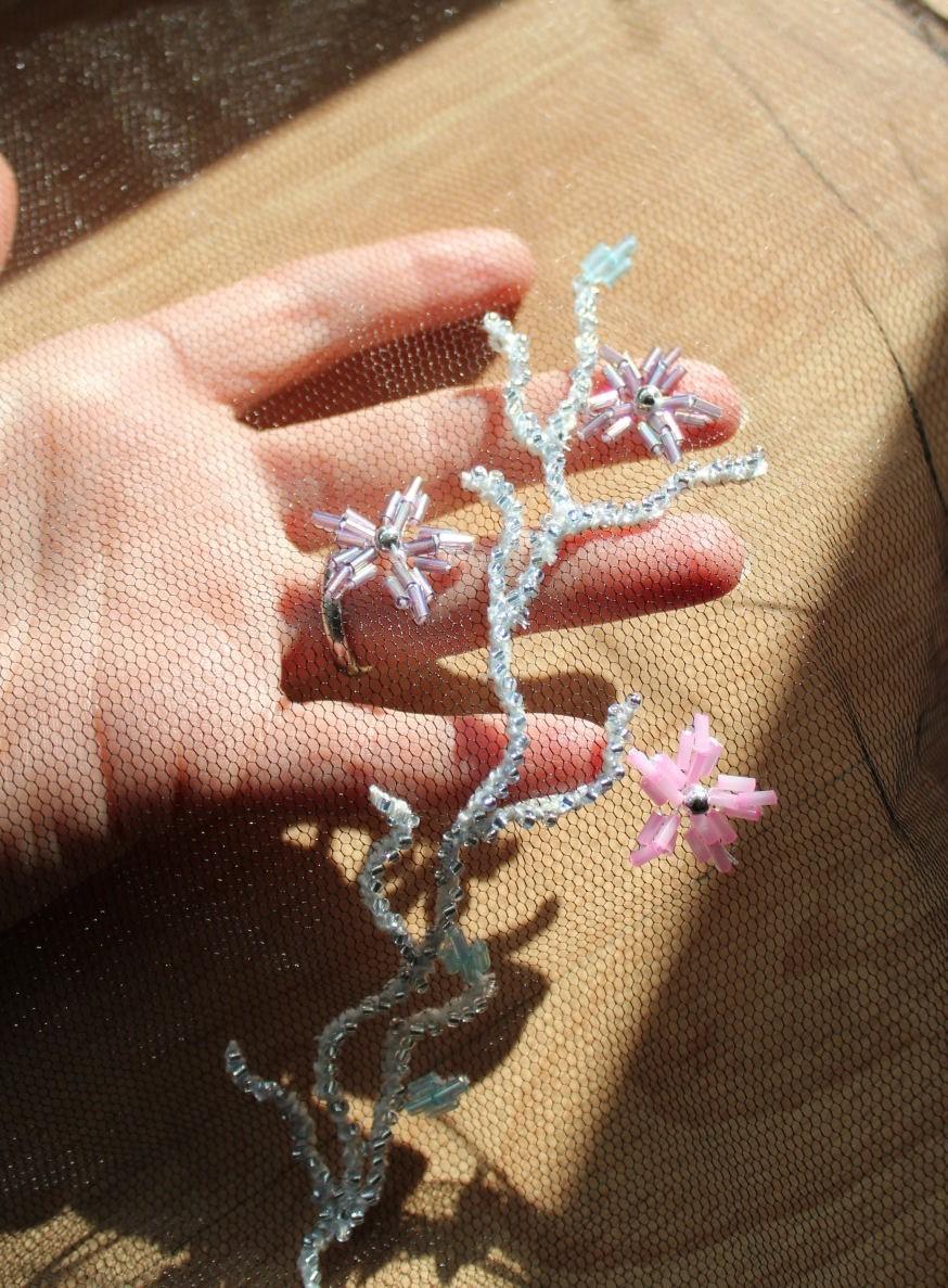 1.первым упражнением было раздербанненый искуственный цветок украсить бусинами и пришить к сетке.