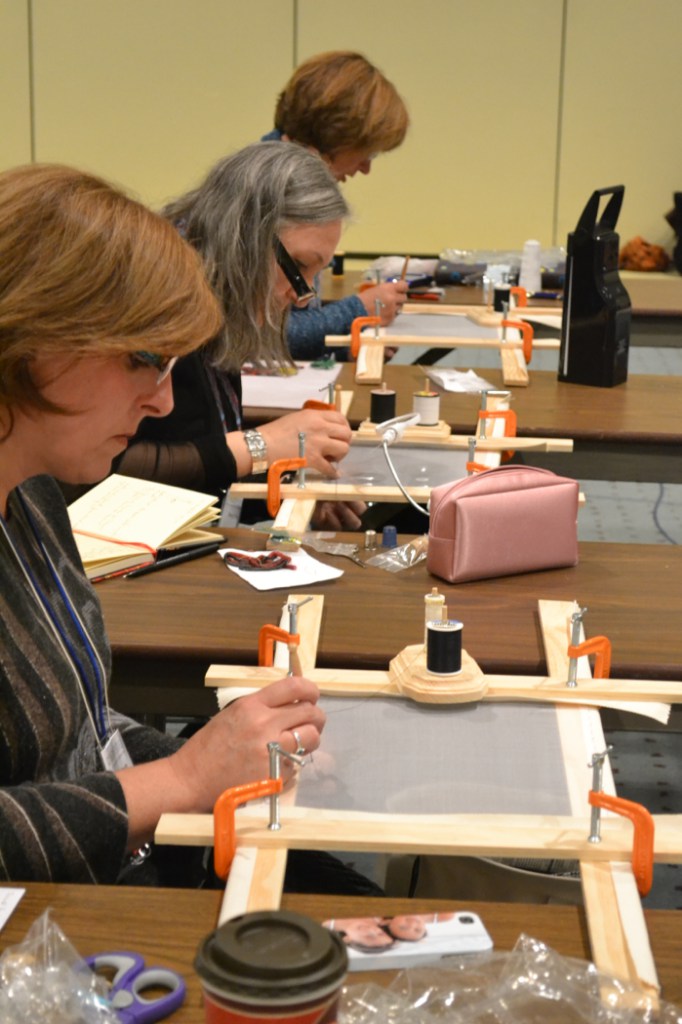 сначала я вышивала на больших тонких английских пяльцах, 31 см диаметром.