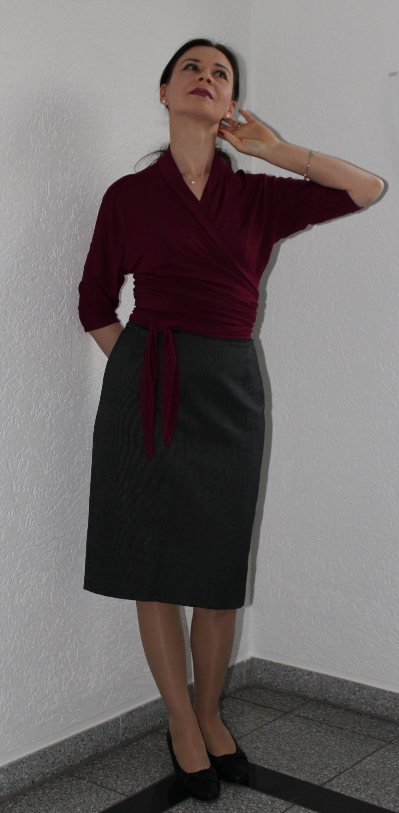 Потрясающий цвет у такой замечательной блузки и великолепно ее сочетание с серой юбкой. Пусть через год, но все же гардероб пополнился такой красивой и стильной вещью.